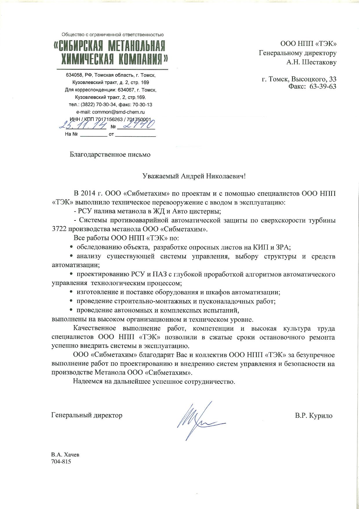 В 2014 г. ООО «Сибметахим» по проектами с помощью специалистов ООО НПП «ТЭК» выполнило техническое перевооружение с вводом в эксплуатацию