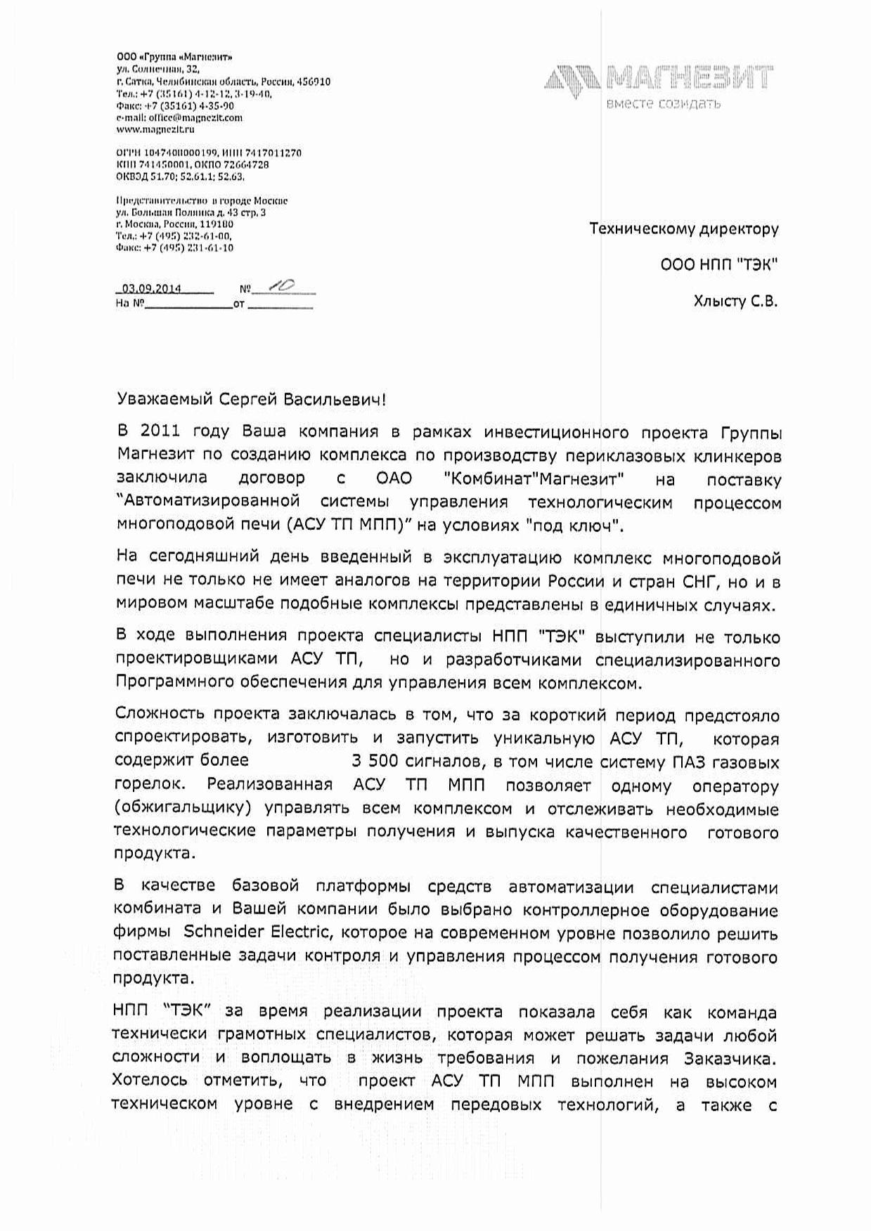 В 2011 году Ваша компания в рамках инвестиционного проекта Группы Магнезит по созданию комплекса по производству периклазовых клинкеров заключила договор C OAO "Комбинат Магнезит" на поставку "Автоматизированной системы управления технологическим процессом многоподовой печи (АСУ ТП МПП)" на условиях "под ключ".