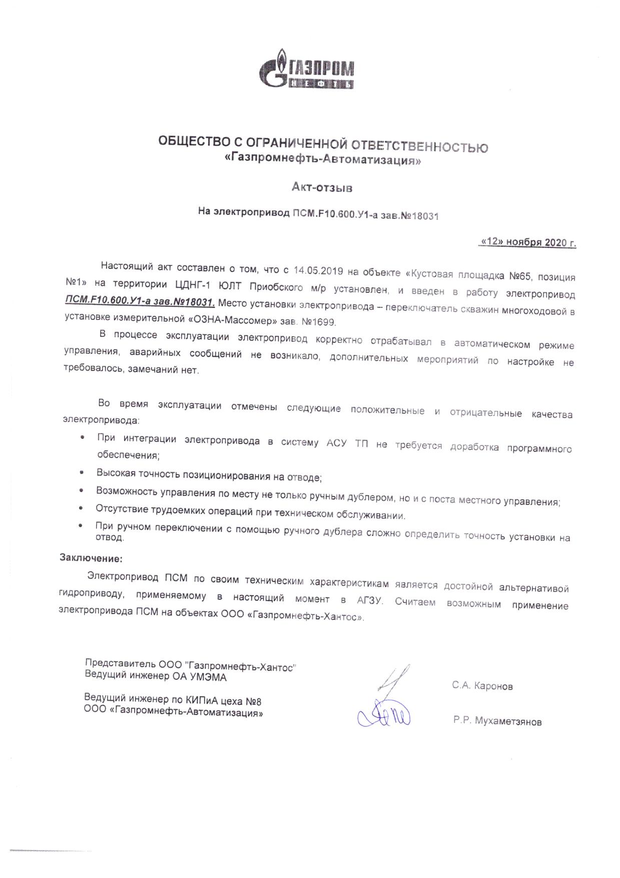 Настоящий акт составлен о том, что с 14.05.2019 на объекте «Кустовая площадка №65, позиция №1» на территории ЦДНГ-1 ЮЛТ Приобского м/р установлен и введен в работу электропривод ПСМ.F10.600. У1-а зав, №18031. Место установки электропривода - переключатель скважин многоходовой в установке измерительной «ОЗНА-Массомер» зав. №1699
